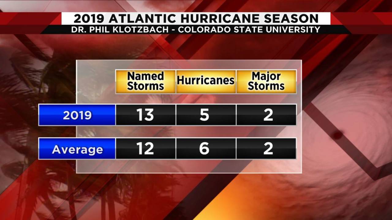 Klotzbach predicts 13 named storms, five hurricanes and two major hurricanes, which is very close to a normal season.