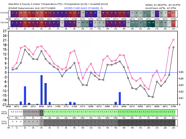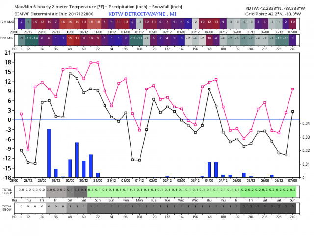 See how many sub zero lows occurs in the model in Chicago and Detroit.