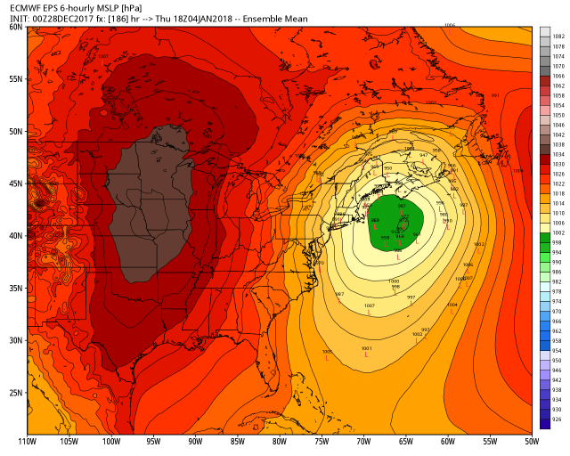 The EPS ensembles favor the offshore low and fill in the notch with snow. My MS thesis suggested in situations where cold air has pushed offshore, the potential energy explosively deepens the low when the lid on convection in the preceding high pressure is released. The offshore secondary takes control. It takes strong dynamics with a negative tilt to overcome that. I would expect the next run to adjust offshore.