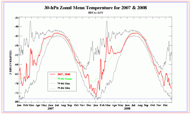 Another low solar east QBO winter (2007/08) saw that cold 30mb 65N-90N give way to Sudden Stratospheric Warming in January (it tends to come earlier in East QBO winters). Notice the warming can be 40C!