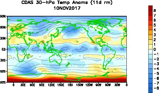 See the follow up time series of 30mb temperature anomalies. The North American warming built to the south and faded but notice it is reloading in the Pacific.