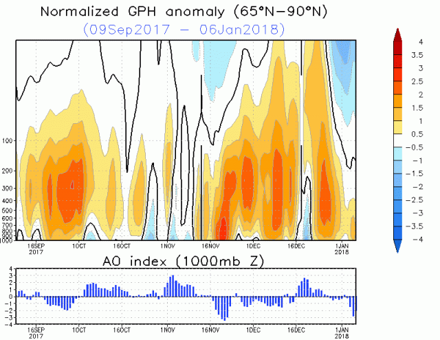 See in the polar height time section the warmth in the polar atmosphere in December. See the cooling high up that peeked around the New year.