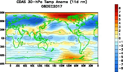 See the follow up time series of 30mb temperature anomalies. The North American warming built to the south and faded but notice it is reloading in the Pacific.